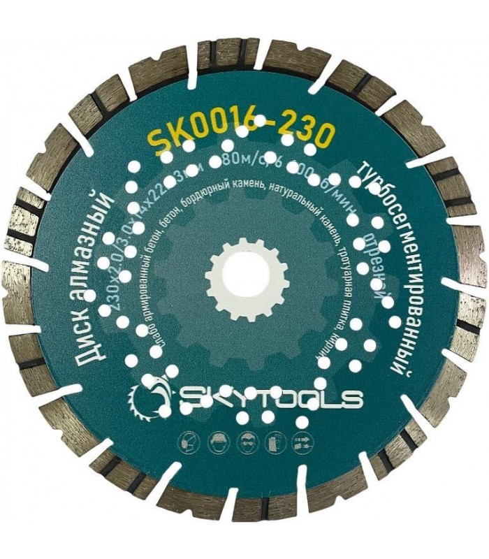 Диск алмазный SKytools SK0016 230x2x3x14x22,2 мм,рифлёные сегменты с увеличенной высотой режущей кромки обеспечивают высокую скорость реза, перфорация дополнительному охлаждению, применяется: бетон, бордюрный камень, натуральный камень, тротуарная плитка, кирпич.